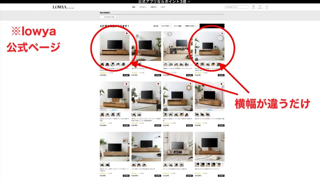 上の画像は、lowyaの公式ページ。で、ページを見るとズラッといっぱいテレビ台があるように見えますが、横幅が違うだけの商品があります。