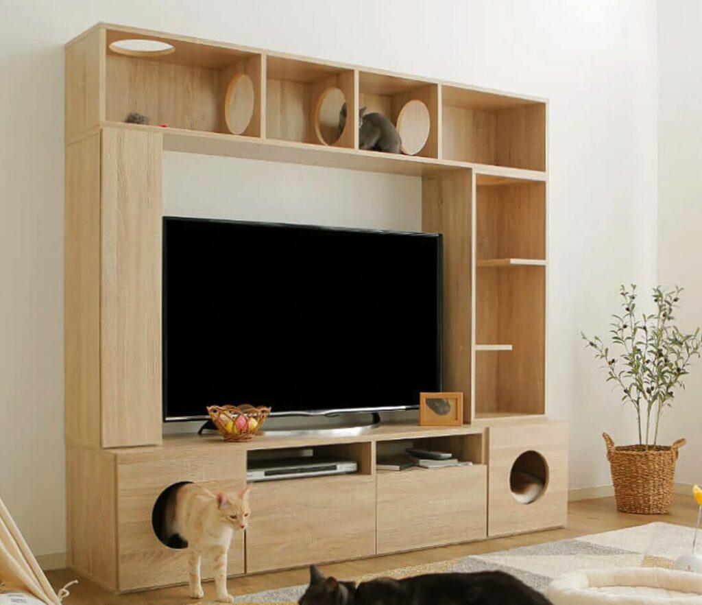 3つあるうちの猫が遊べるテレビ台。収納というよりも猫ちゃんが遊べるスペース作ってるのがこのテレビ台の特徴。